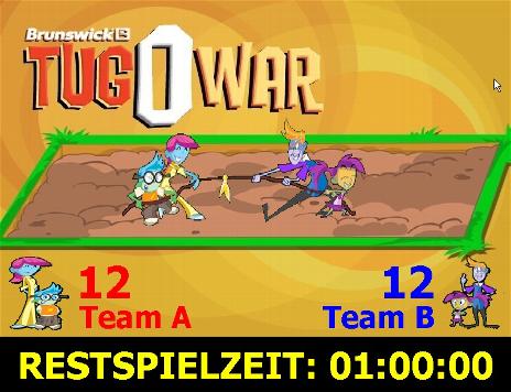 Beim Tug-O-War treten zwei Teams gegeneinander an. Die Teams setzten sich folgendermaßen zusammen. Team A ist die erste Hälfte ihre Bahnanzahl und Team B die zweite Hälfte Ihrer Bahnanzahl z.B. sie haben 12 Bahnen dann sind im Team A Bahn 1-6 und im Team B Bahn 6 - 12. Wenn ein Team das andere über die Spiellinie gezogen hat ist dieses der Gewinner. Variante 1: In diesem Modus gewinnt das ganze Team und sie können dann über das Spiel Speed-Strike eine Gewinn ausspielen. Um diesen einzustellen deaktivieren Sie bitte unter Spieleinstellungen Ausgabe Best 3. Variante 2: In diesem Modus spielen die Bahnen zwar in Teams, aber Gewinner ist die Bahn die im Spielverlauf die meisten Strikes erspielt hat. Um diesen einzustellen aktivieren Sie bitte unter Spieleinstellungen Ausgabe Best 3.