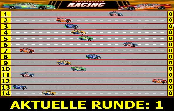 Beim Championship Racing bekommt jede Bahn eine Spielfigur. Das Ziel dieses Spiels ist das jede Bahn versucht soviel wie möglich Strikes zu erspielen. Bei jedem Strike wird die Spielfigur der jeweiligen Bahn eine Position nach vorne gesetzt. Das Spiel läuft über eine bestimmte Zeit. In dieser Zeit werden mehrere Spielrunden gespielt. Um eine Spielrunde zu gewinnen müssen die Bahnen eine bestimmte Anzahl von Strike erspielen. Ist eine Bahn über die Ziellinie gefahren wird der Rundengewinnerschirm aufgerufen und diese Bahn beglückwünscht. Es erhalten nun je nach Einstellungen im Punktesystem die Bahnen Ihre erspielten Punkte. Gewinner ist die Bahn die nach Ablauf der Spielzeit die meinten Punkte erspielt hat.